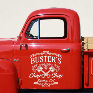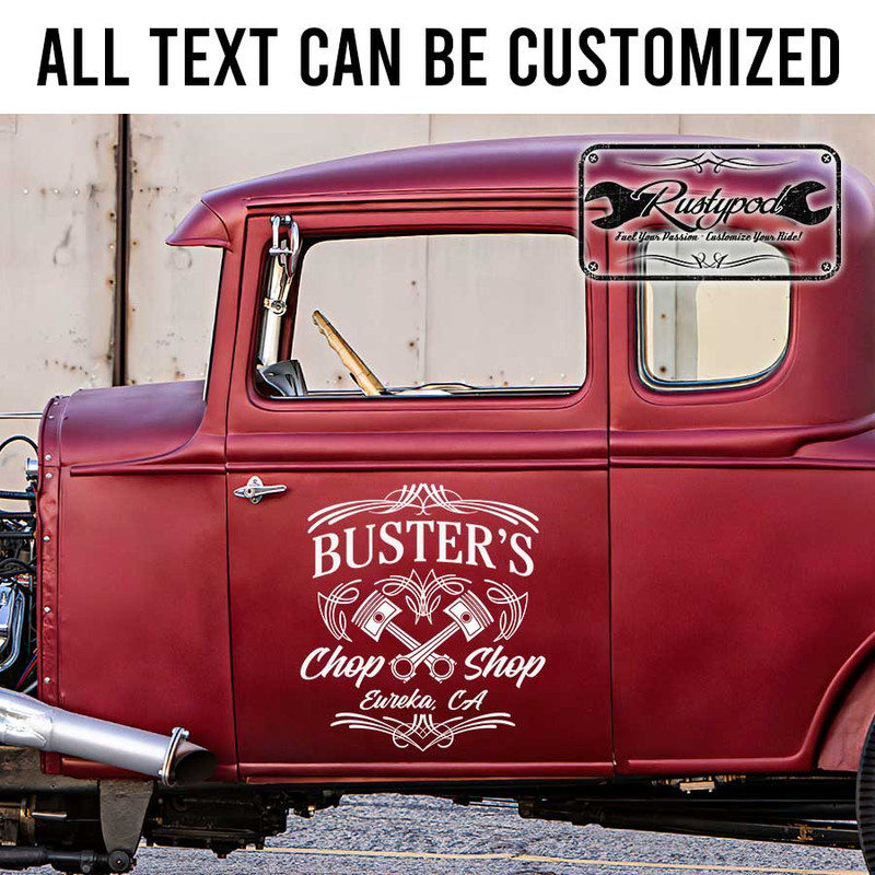 personalized pinstriping crossing piston shop shop lettering sign hot rod garage kustom kulture sticker uses UV printing technology on durable vinyl panels, ensuring long-lasting performance and resistance to environmental factors. These decals are safe for all vehicle surfaces and are easy to apply. The design can be customized according to customer needs.
