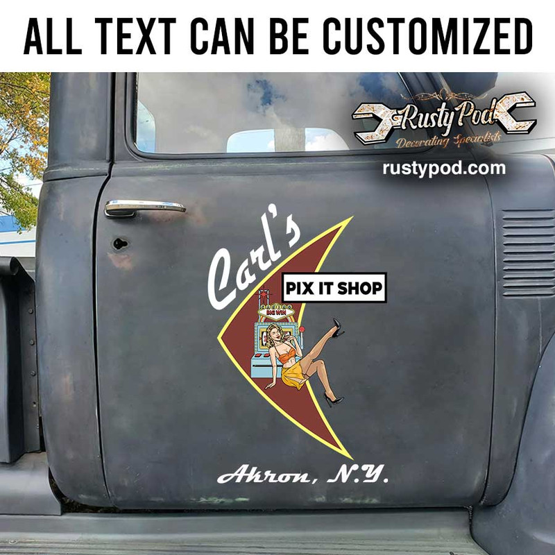 Customization is available, allowing you to personalize the **personalized pinup girl lettering fix it shop lettering door sign shop truck lettering door sign sticker** to your exact specifications. The contour cut option eliminates excess decal, giving the appearance that the design is painted on. Suitable for cars, motorbikes, glass doors, and more, these decals are a great way to express individuality or promote your brand.