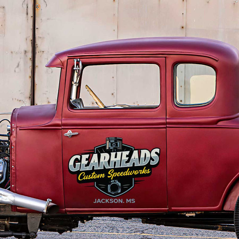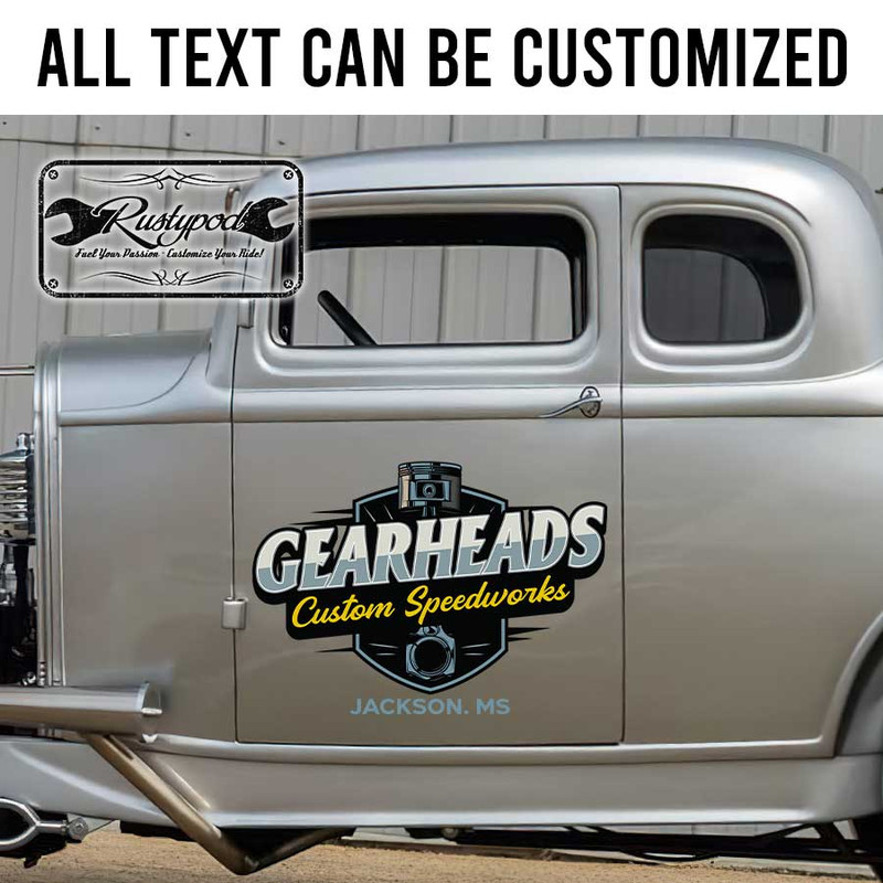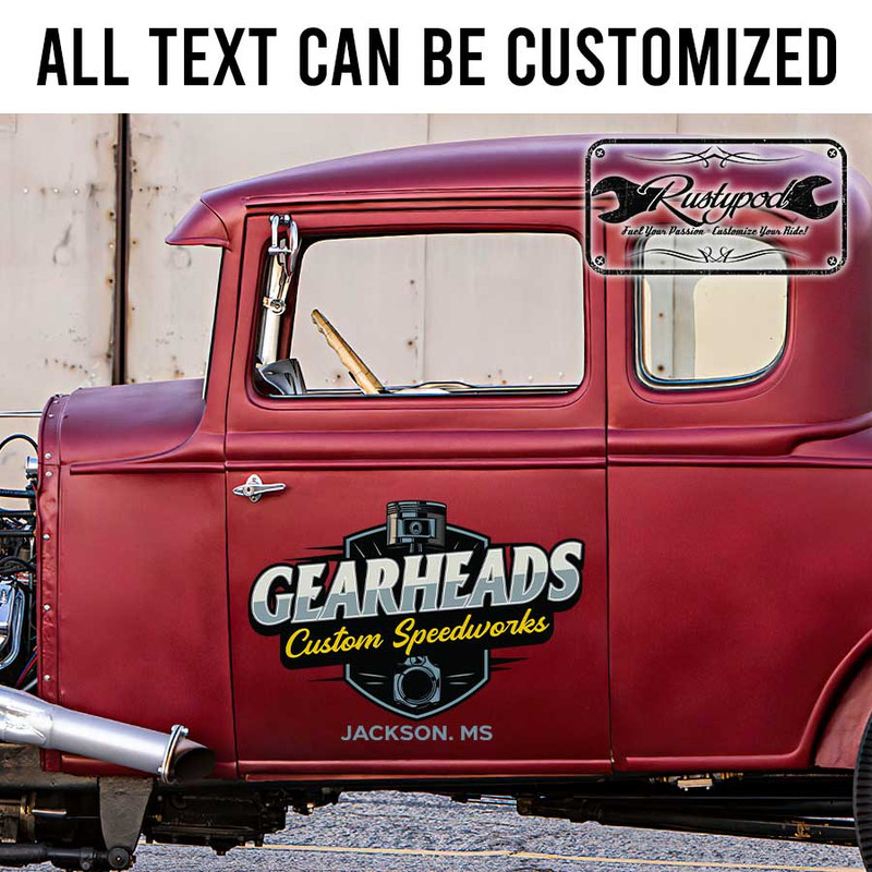 personalized piston and gearhead lettering custom hot rod sign shop truck door art vehicle lettering sticker uses advanced UV printing technology on durable vinyl panels. This ensures high durability and strong resistance to environmental impacts.