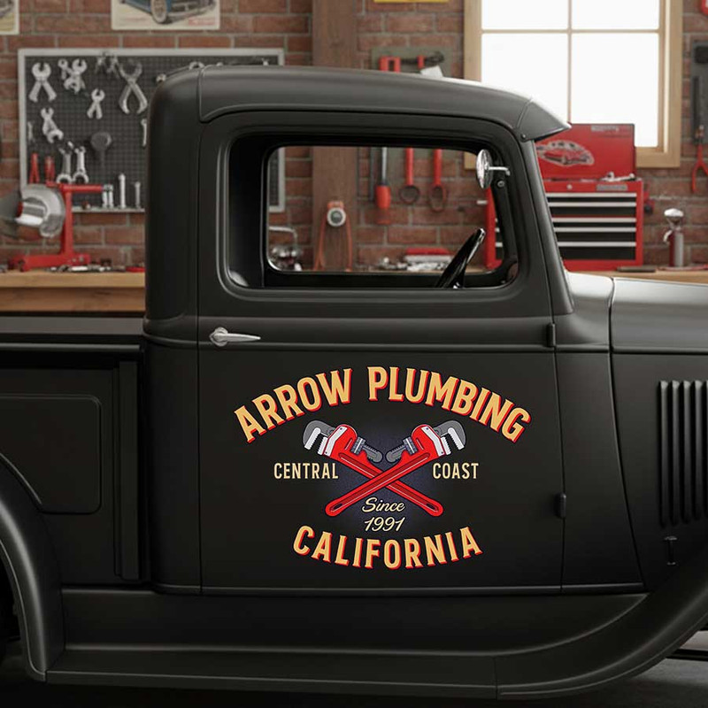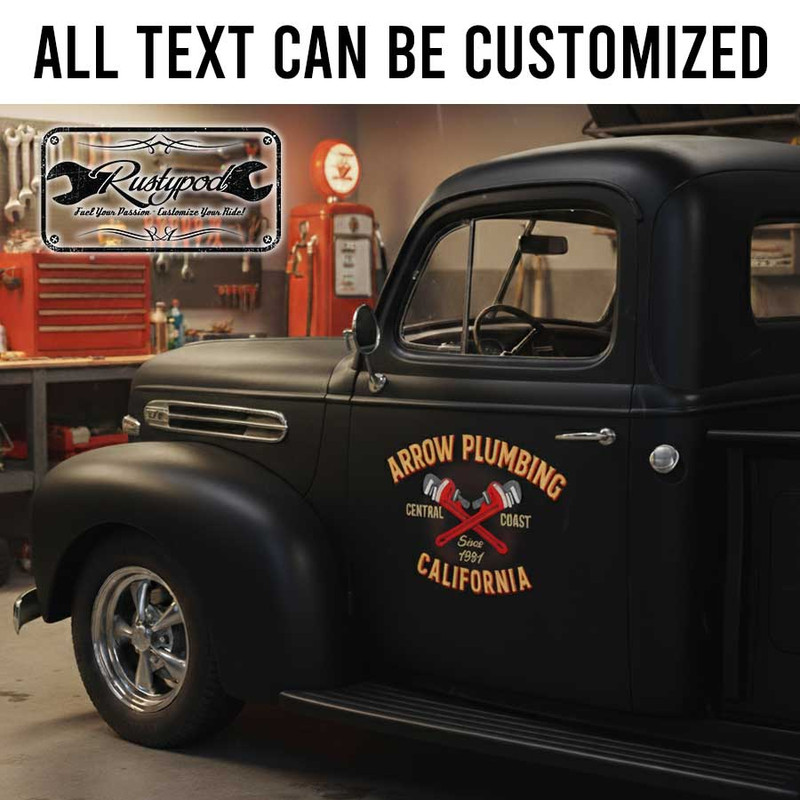 personalized plumbing company sign decal vehicle graphics decal kustom kulture sticker is produced using advanced UV printing technology on high-quality vinyl panels, ensuring superior durability and vibrant colors. This product is designed to resist various environmental impacts, providing long-lasting performance even under harsh conditions. It is safe for all vehicle surfaces and exceptionally easy to apply, making it suitable for both beginners and professionals.