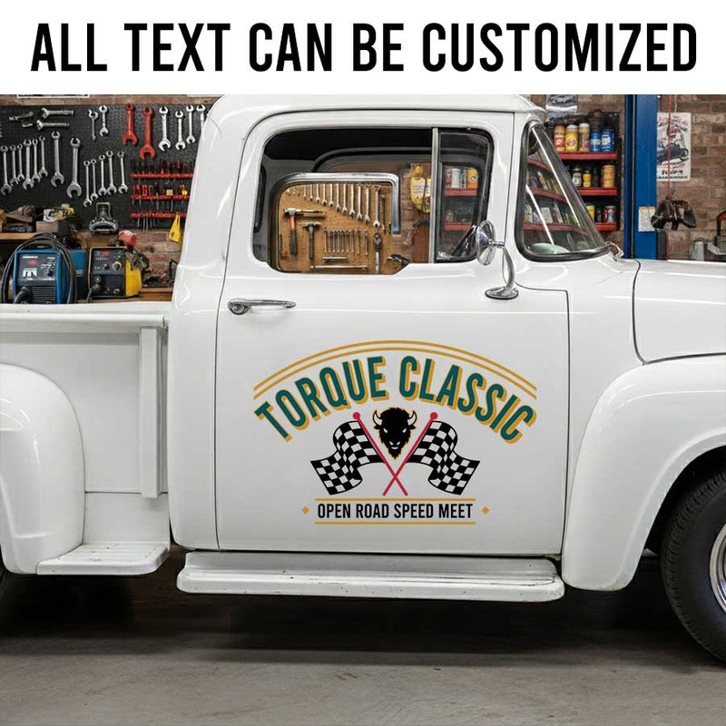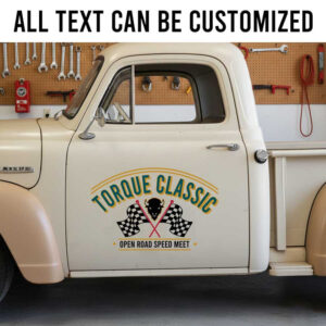 Personalized Racing Event Car Decal – Vintage Torque Classic Logo with Checkered Flags for Auto Enthusiasts sticker is produced using advanced UV printing technology on high-quality vinyl panels, ensuring sharp, vibrant visuals and exceptional durability over time.