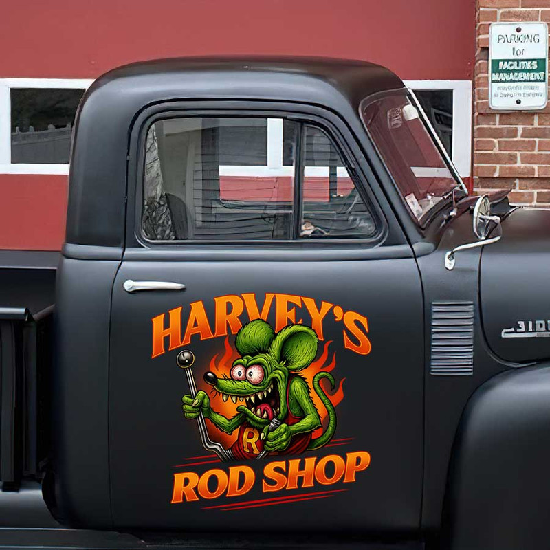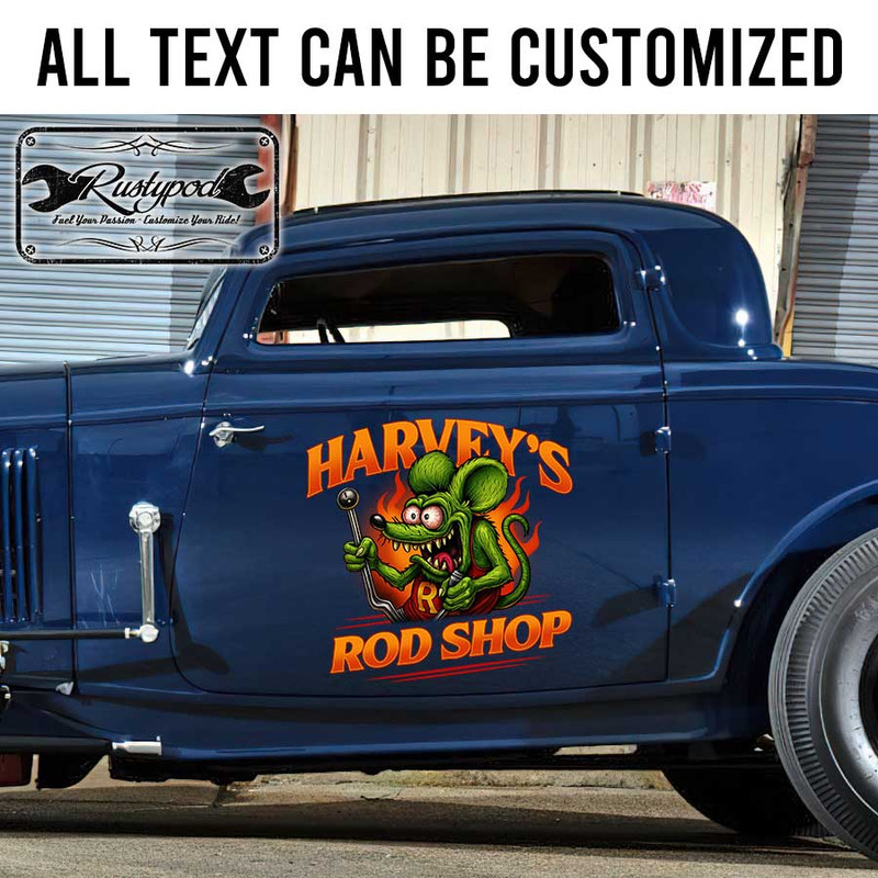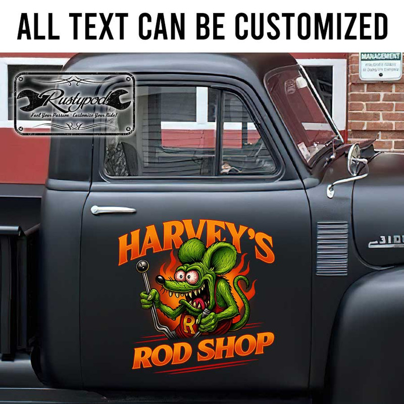 personalized rat fink lettering rod shop door sign rat rod lettering kustom kulture sticker uses advanced UV printing technology on durable vinyl panels, ensuring high resistance to environmental elements while being completely safe for vehicle surfaces.