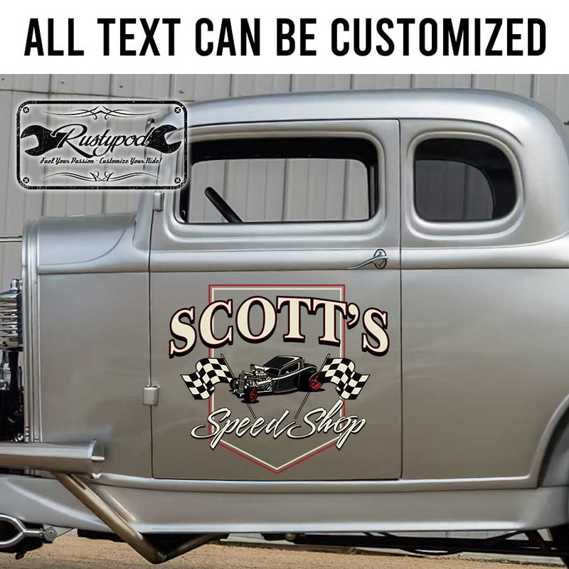 personalized rat rod and checkered flag lettering speed shop door sign racing car sign sticker uses advanced UV printing technology on durable vinyl panels.