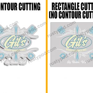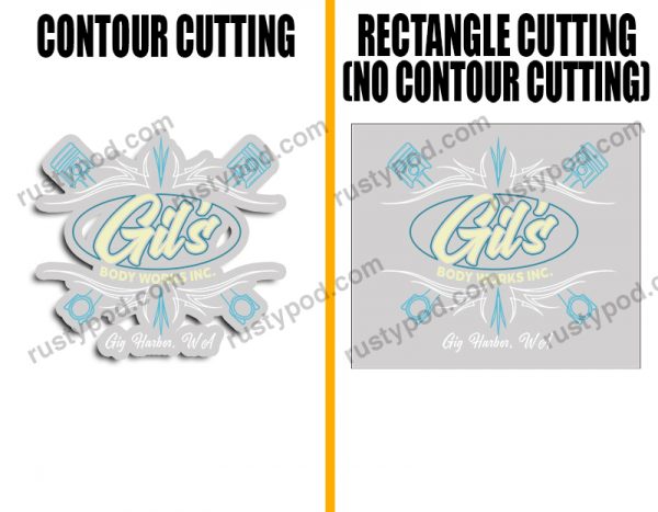 - Contour Cutting/Trim means that the decals are printed with an outline hugging the design. Meanwhile, with no contour cut, the outline will be a rectangle instead.