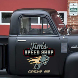 personalized running piston lettering speed shop sign shop truck door art performance and fabrication garage lettering sticker uses advanced UV printing technology on durable vinyl panels. This ensures exceptional durability and resistance to environmental impacts while remaining safe for vehicle surfaces.