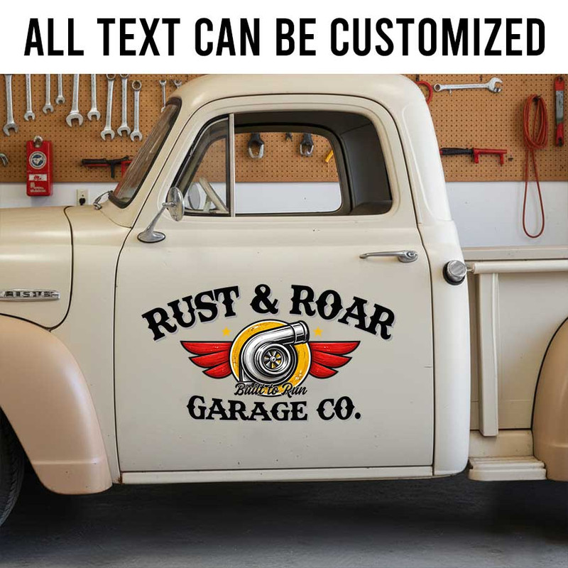 Personalized Rust & Roar Garage Co Turbo Logo Car Door Decal for Classic Truck Owners and Hot Rod Builders sticker 14187