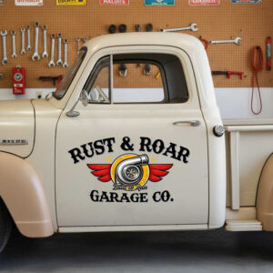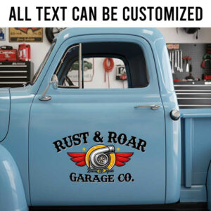 Personalized Rust & Roar Garage Co Turbo Logo Car Door Decal for Classic Truck Owners and Hot Rod Builders sticker is produced using advanced UV printing technology on high-quality vinyl panels, ensuring sharp, vibrant visuals and exceptional durability over time.