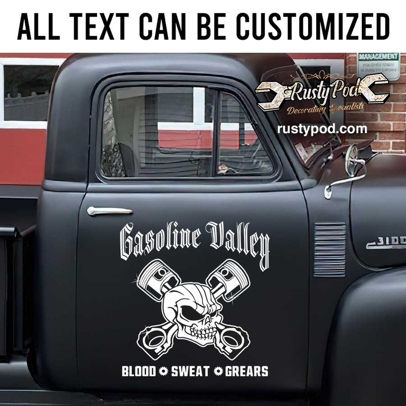 personalized skull and crossing piston lettering hot rod sticker shop truck door sign speed shop sign rat rod door art sticker 12791