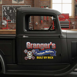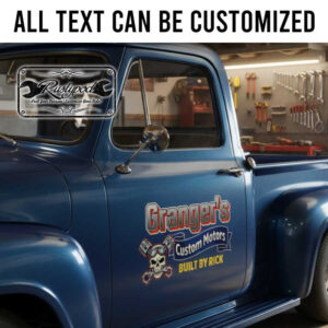 personalized skull and piston lettering decal custom motor garage sign decal hot rod lettering sticker uses UV printing technology on durable vinyl panels, offering strong resistance to environmental impacts and ensuring safety for vehicle surfaces.