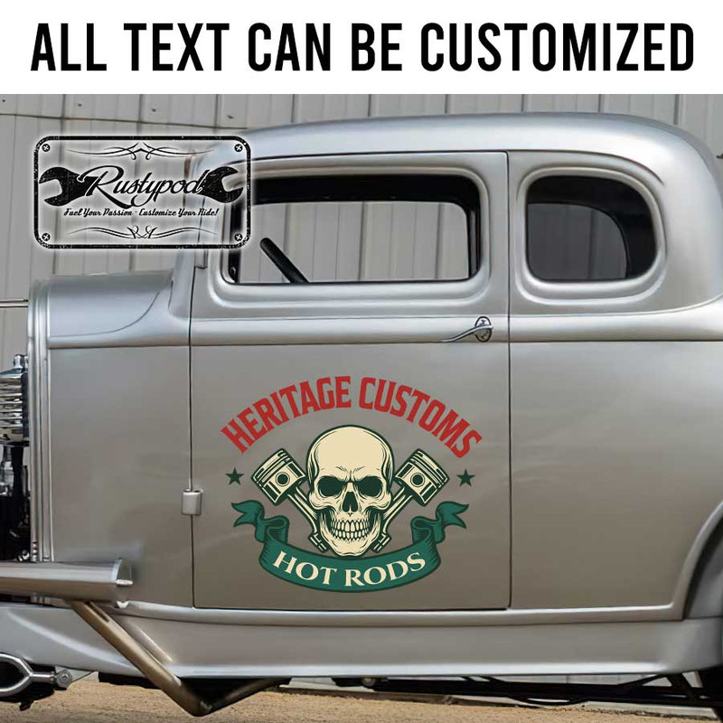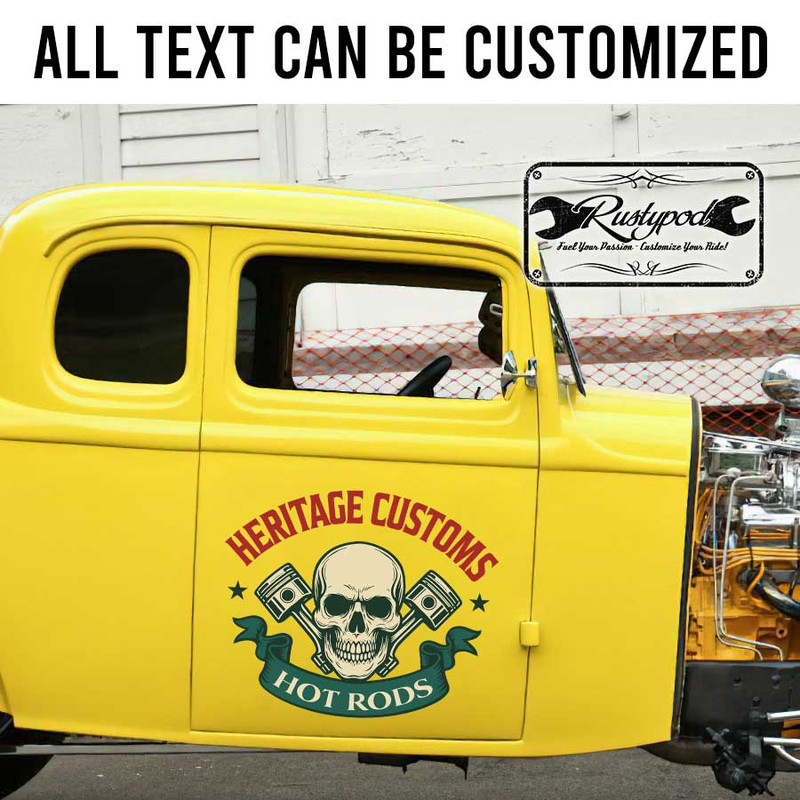 personalized skull and ribbon hot rod lettering vintage truck lettering crossing piston lettering sign sticker 13236