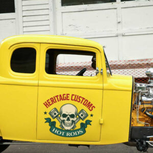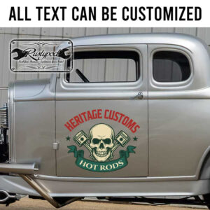 personalized skull and ribbon hot rod lettering vintage truck lettering crossing piston lettering sign sticker uses advanced UV printing technology on durable vinyl panels. This ensures high durability and strong resistance to environmental impacts.