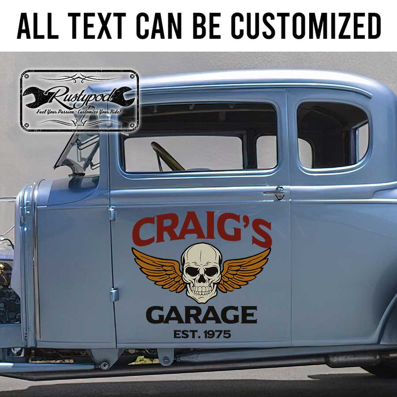 personalized skull and wing shop truck lettering hot rod lettering car lettering sticker utilizes UV printing technology on high-quality vinyl panels, ensuring exceptional durability and resistance to environmental factors. It’s designed to be safe for all vehicle surfaces and incredibly easy to apply.