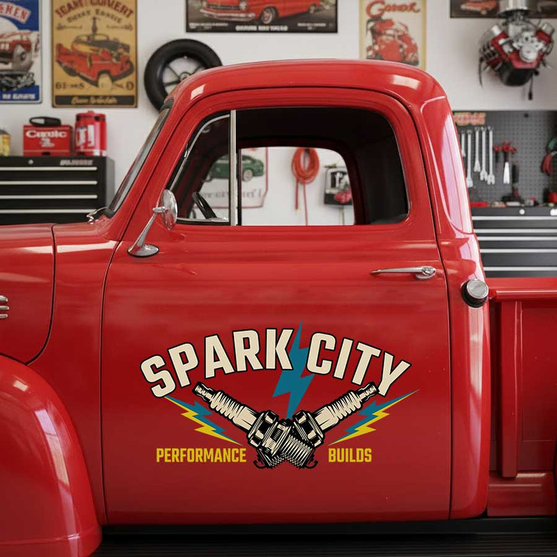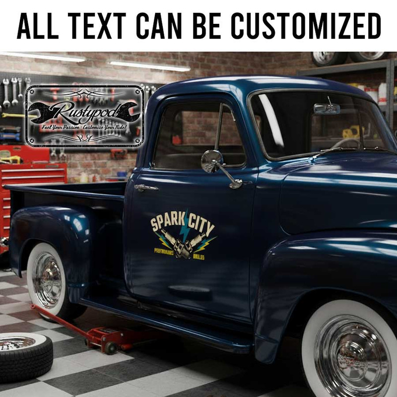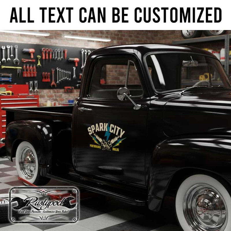 personalized spark plug lettering decal performance build garage lettering decal kustom kulture decal shop truck door sign sticker is produced using advanced UV printing technology on high-quality vinyl panels, ensuring superior durability and vibrant colors. This product is designed to resist various environmental impacts, providing long-lasting performance even under harsh conditions. It is safe for all vehicle surfaces and exceptionally easy to apply, making it suitable for both beginners and professionals.