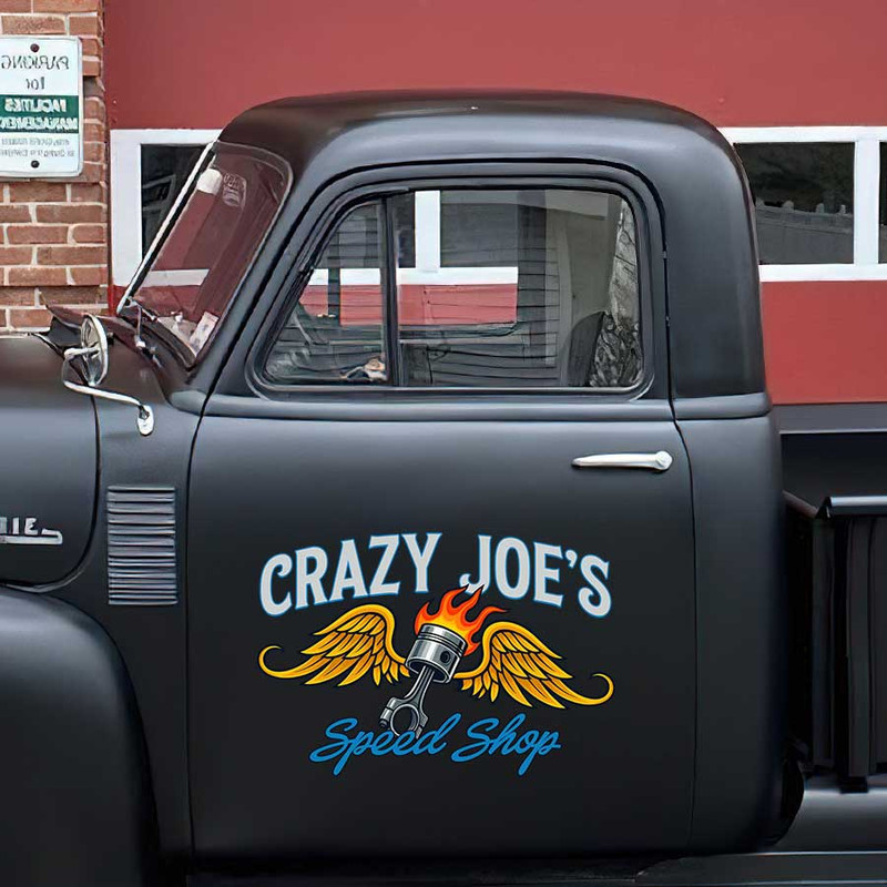 personalized speed shop sign piston and wing lettering hot rod lettering rat rod door art sticker is crafted using UV printing technology on high-quality vinyl panels, ensuring long-lasting durability and resistance to environmental factors. This product is safe for vehicle surfaces and easy to apply. Our designs can be customized to your preferences, and you can choose a contour cut option that eliminates excess decal, giving the appearance of a painted design. These decals are suitable for application on cars, motorbikes, glass doors, and more, perfect for expressing personality or promoting your brand.