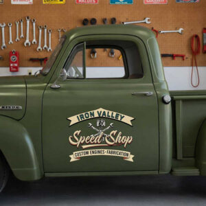 Personalized Speed Shop Truck Decal – Vintage Script Logo with Piston and Wrench Design for Custom Engine Builders sticker is produced using advanced UV printing technology on high-quality vinyl panels, ensuring sharp, vibrant visuals and exceptional durability over time.
