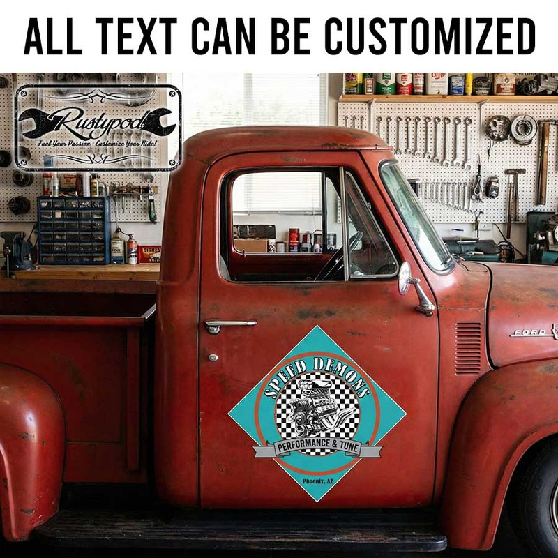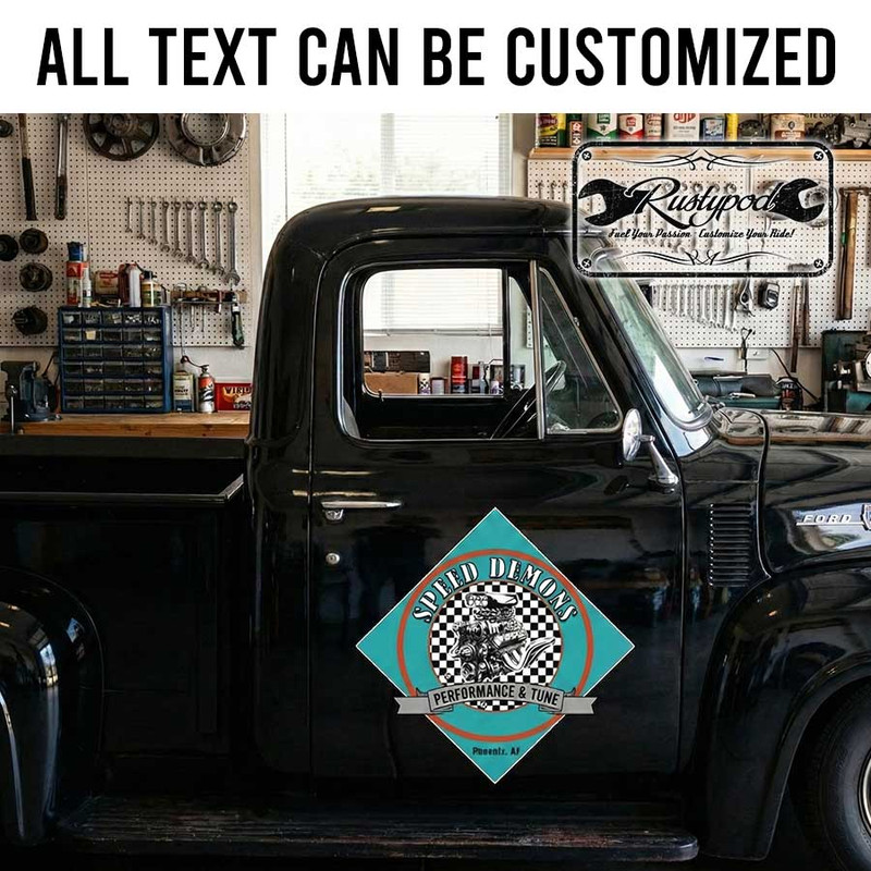 personalized speed up demon sign decal hot rod decal checkered flag lettering decal muscle car logo sticker 13952