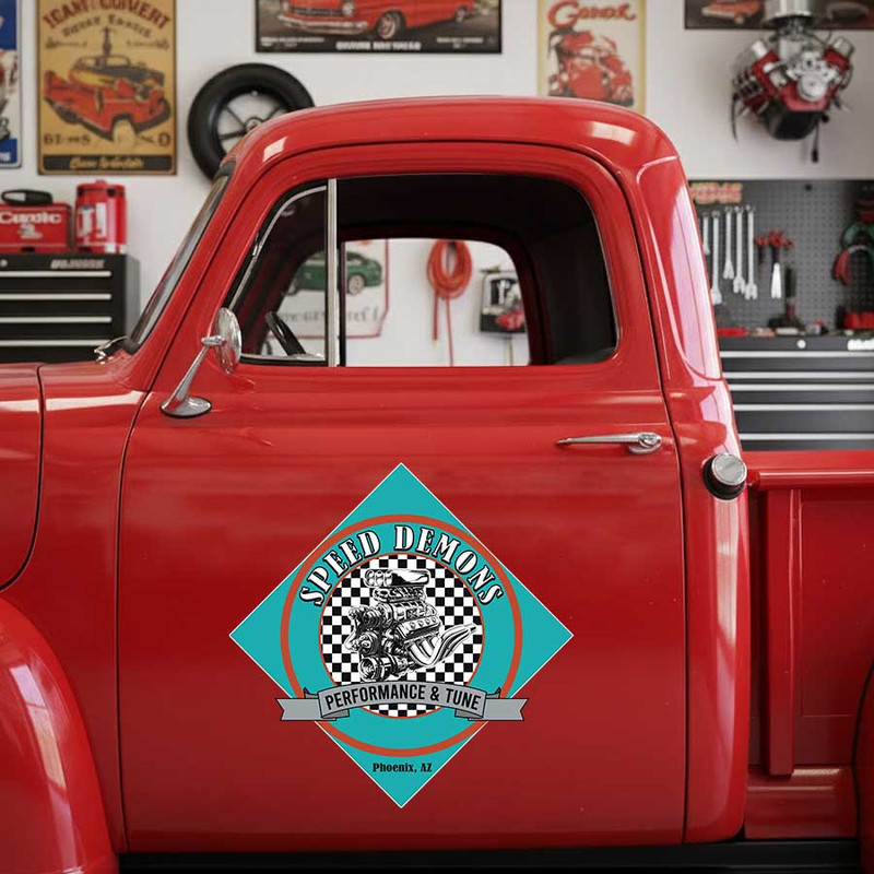 personalized speed up demon sign decal hot rod decal checkered flag lettering decal muscle car logo sticker utilizes advanced UV printing technology on high-quality vinyl panels, ensuring vivid colors and outstanding durability. The decal boasts excellent resistance to environmental impacts such as sunlight, rain, and scratches, and is completely safe for all vehicle surfaces. Application is quick and hassle-free, making it perfect for both personal and business use. We offer customization according to your unique requirements and provide a contour cut option to remove excess material, creating a painted-on appearance for your sticker. Our products are ideal for cars, motorbikes, glass doors, and more, perfectly suited for showcasing personality or advertising your brand.