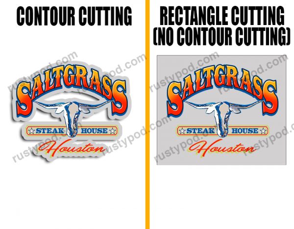 - Contour Cutting/Trim means that the decals are printed with an outline hugging the design. Meanwhile, with no contour cut, the outline will be a rectangle instead.