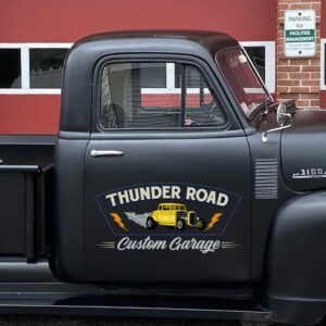 personalized thunder road custom garage lettering decal shop truck door art decal hot rod decal kustom kulture sticker utilizes advanced UV printing technology on high-quality vinyl panels, ensuring vivid colors and outstanding durability. The decal boasts excellent resistance to environmental impacts such as sunlight, rain, and scratches, and is completely safe for all vehicle surfaces. Application is quick and hassle-free, making it perfect for both personal and business use. We offer customization according to your unique requirements and provide a contour cut option to remove excess material, creating a painted-on appearance for your sticker. Our products are ideal for cars, motorbikes, glass doors, and more, perfectly suited for showcasing personality or advertising your brand.