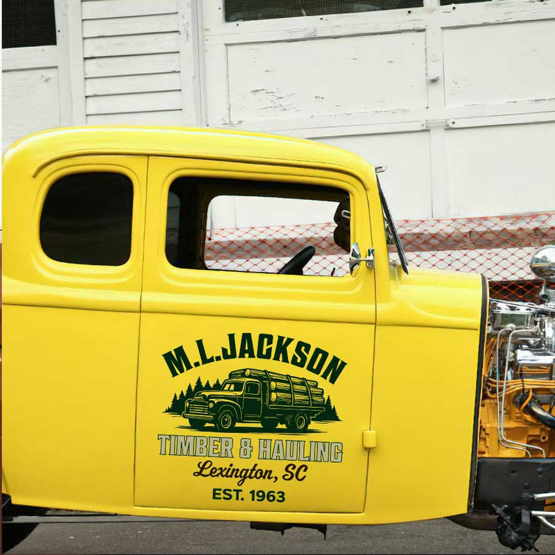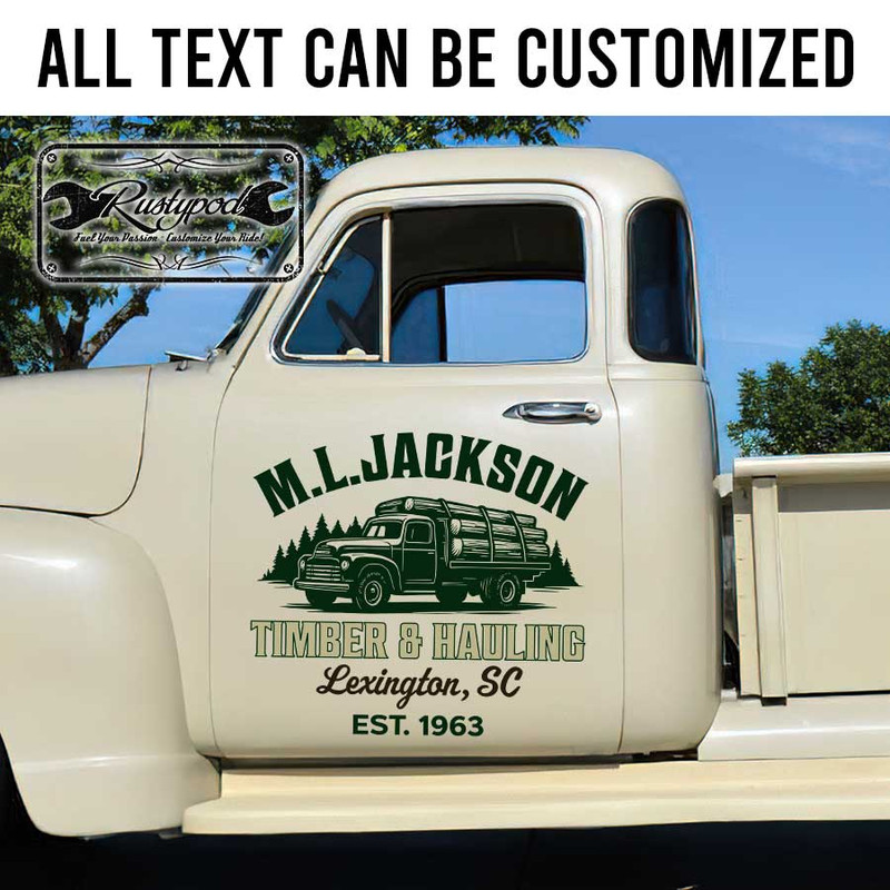 personalized timber and hauling lumberjack door sign woodworking sign sticker uses UV printing technology on vinyl panels, ensuring outstanding durability and resistance to environmental impacts. This product is safe for vehicle surfaces and easy to apply. The design can be customized according to customer requirements. It also offers the option of contour cut, eliminating excess decal and making the sticker appear as if it is painted on.