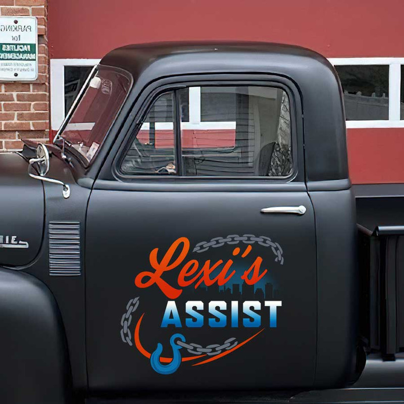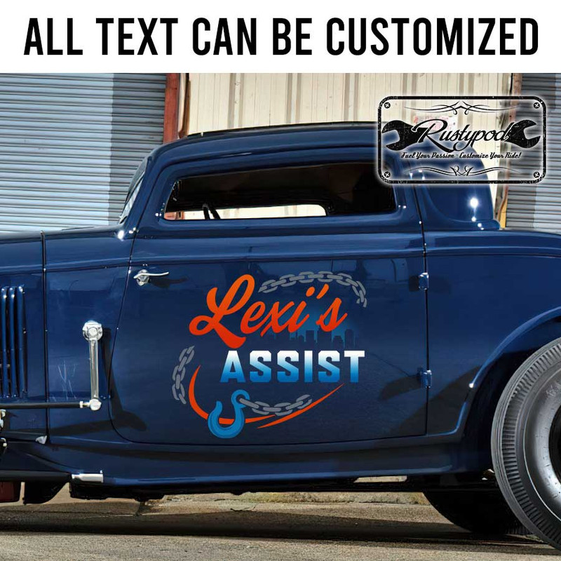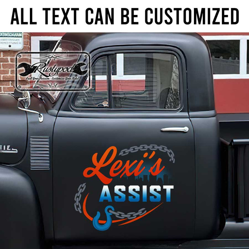 personalized towing truck lettering sign hook symbol logo recovery garage sign sticker uses advanced UV printing technology on vinyl panels, ensuring high durability and excellent resistance to environmental impacts. It is completely safe for vehicle surfaces and offers easy application.