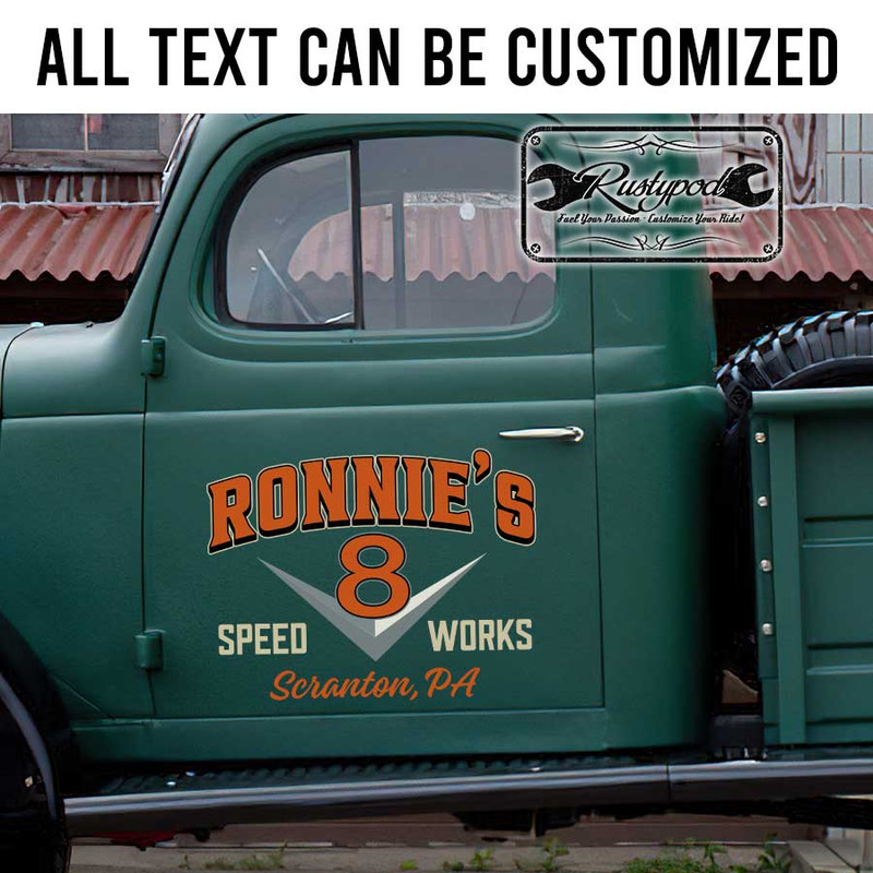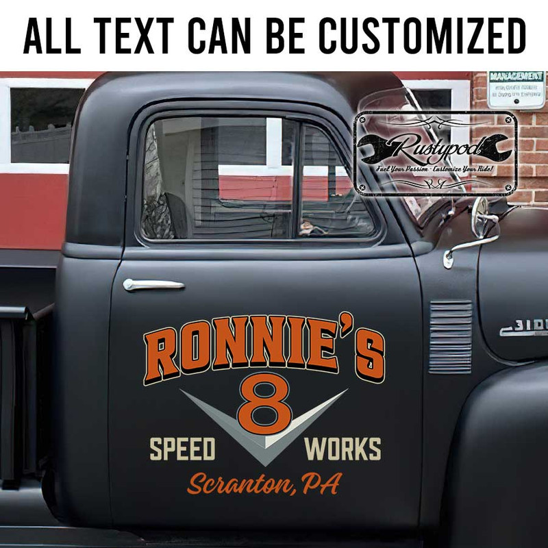personalized v8 engine lettering speed work door art hot rod lettering rat rod door sign sticker uses advanced UV printing technology on durable vinyl panels, ensuring high resistance to environmental elements while being completely safe for vehicle surfaces.