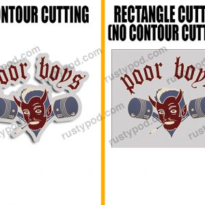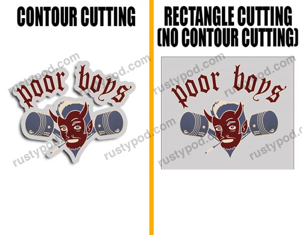 • Contour Cutting/Trim means that the decals are printed with an outline hugging the design. Meanwhile, with no contour cut, the outline will be a rectangle instead.