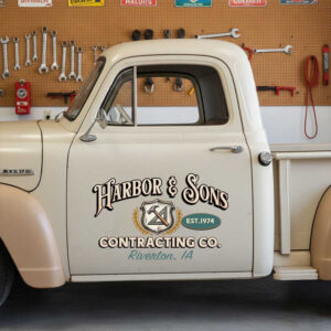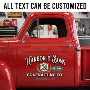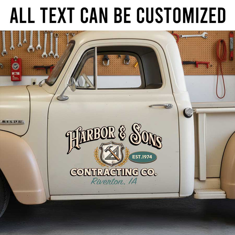 Personalized Vintage Contracting Company Truck Door Lettering Decal with Established Date and City for Construction Businesses sticker is produced using advanced UV printing technology on high-quality vinyl panels, ensuring sharp, vibrant visuals and exceptional durability over time.