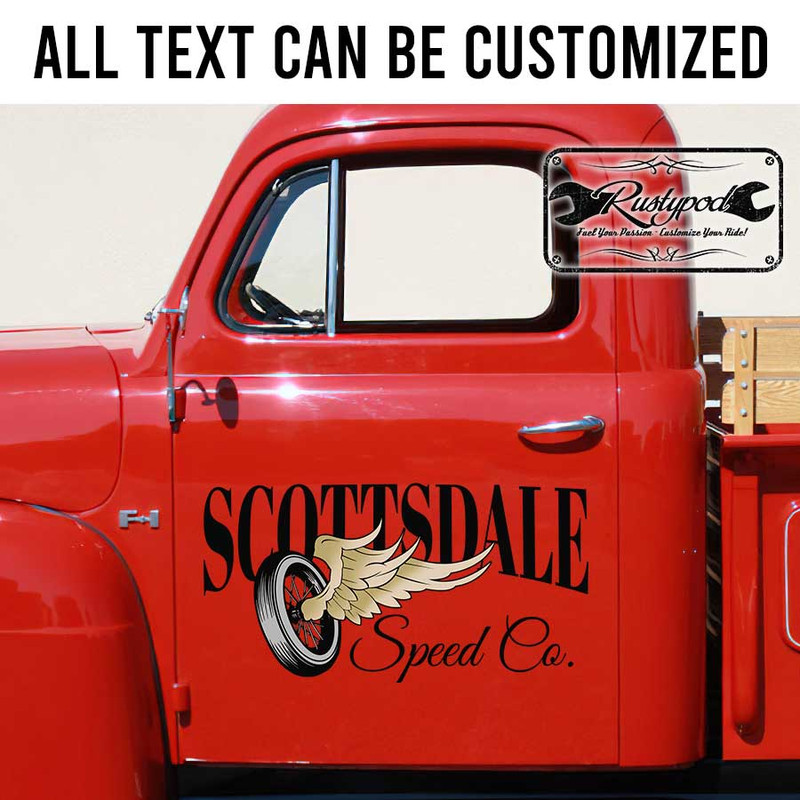 personalized winged wheel lettering hot rod door art rat rod lettering shop truck door art speed shop lettering sticker uses advanced UV printing technology on durable vinyl panels.