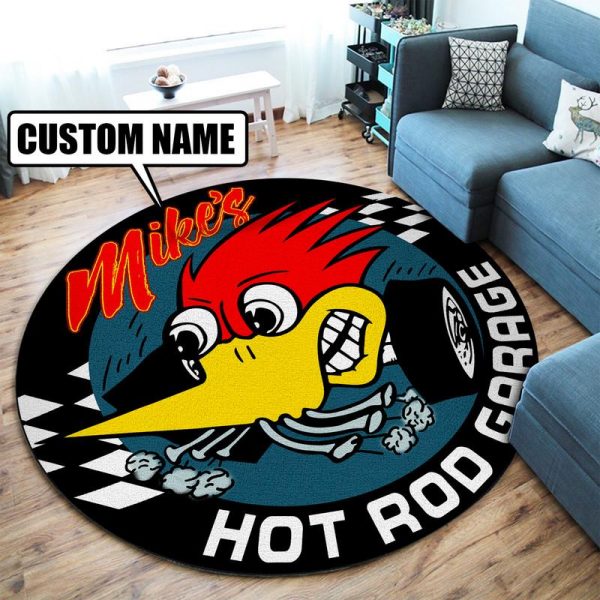 personalized woodpecker hot rod round mat 08636