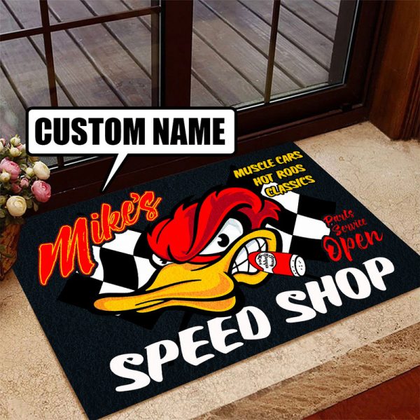 personalized woodpecker hot rod | speed shop parts service door mat 08803