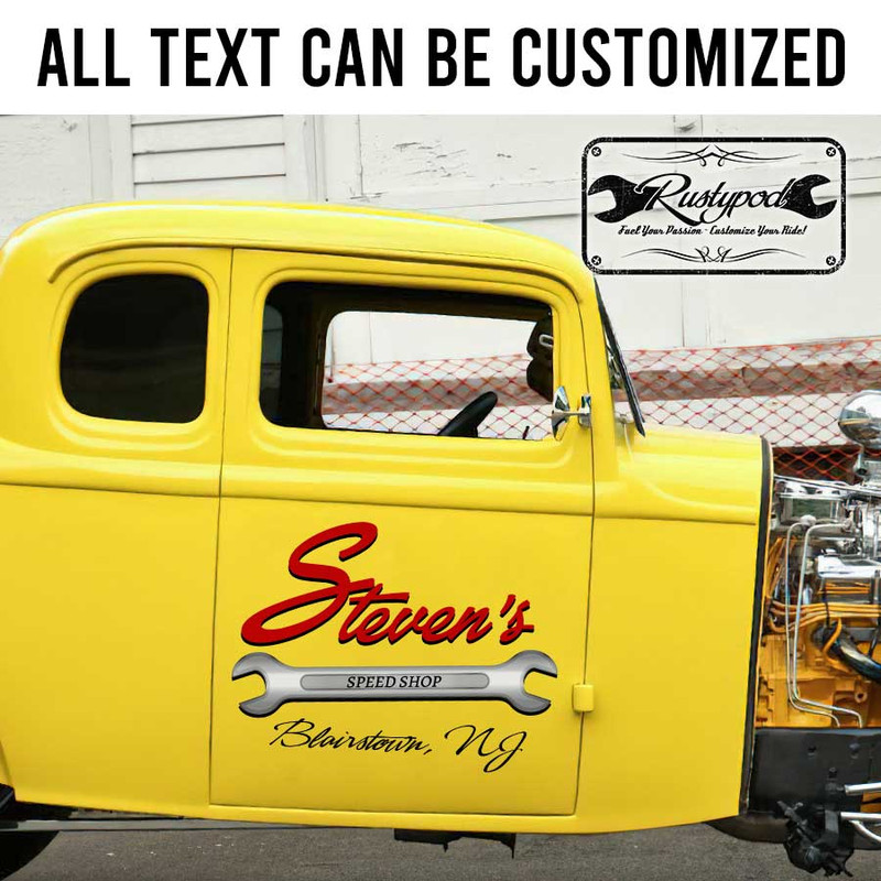 personalized wrench lettering hot rod garage speed shop sign kustom kulture sign writing sticker uses advanced UV printing technology on durable vinyl panels.