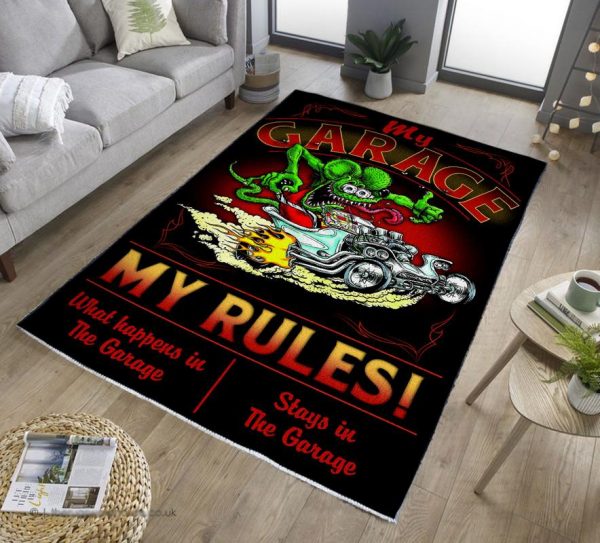 The addition of a high-quality Rat fink rug | My garage my rules can enhance the look and feel of every room in your home or office. These rugs have an elegant touch that makes it easy for you to achieve a very elegant atmosphere wherever you walk into. Just imagine walking into your bedroom or living space with a fabulous rug on the floor!
